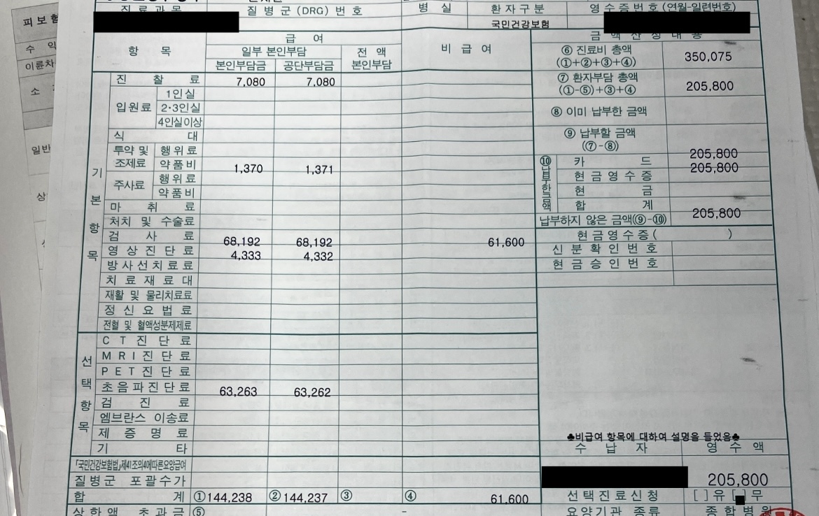 수술 전 검사에 대한 전체 비용은 병원에 따라 다를 수 있으나, 저의 경우엔 205,800원이 들었습니다.