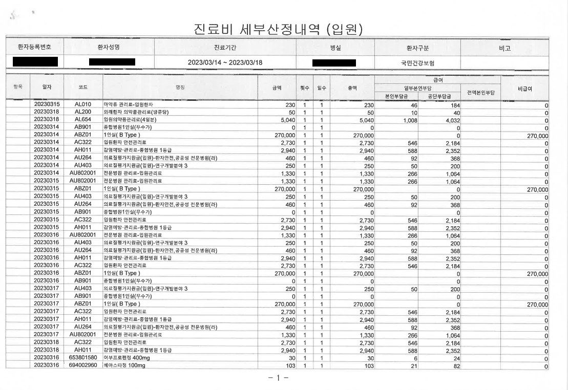 수술 후 퇴원하는 날, 병원비 금액을 확인하니 금액은 11,198,254원이 나왔습니다.